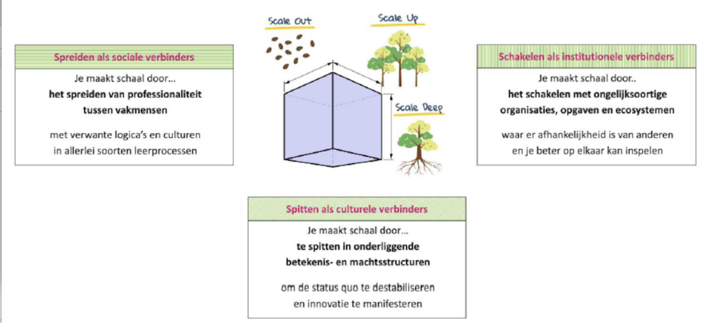 Moore e.a. (2015) zien de drie vormen als een palet waaruit vernieuwers kunnen kiezen, afhankelijk van het effect dat ze willen bereiken. Maar, en dat is een belangrijke nuance, opschaling als begrip vertelt niet hoe je schaal bereikt. Vermaak (2025) stelt het scherp: „Woorden als ‘opschalen’ verhullen de wijze waarop je die schaal bereikt. Wat voor activiteiten liggen daaraan ten grondslag?” (p. 148).